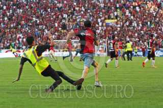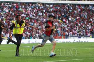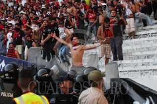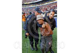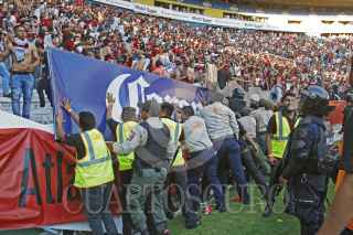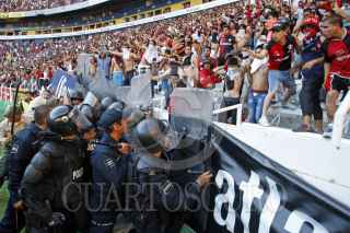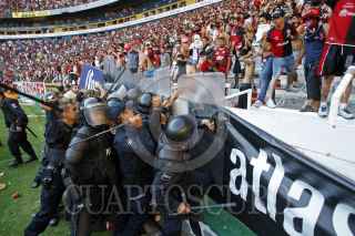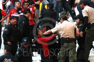 GUADALAJARA, JALISCO. 17MAYO2015.-Aficionados de la barra del Atlas protagonizaron un enfrentamiento a golpes con policías de Guadalajara en el estadio Jalisco, asi como algunos aficionados invadieron la cancha, esto durante el partido correspondiente a la vuelta de los Cuartos de Final del Torneo Clausura 2015 de la Liga MX, en donde se enfrentan los equipos de las Chivas de Guadalajara frente a las los Zorros del Atlas. FOTO: FERNANDO CARRANZA GARCIA / CUARTOSCURO.COM