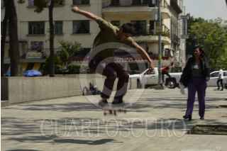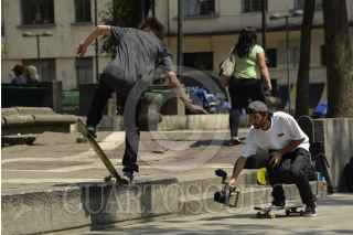 MÉXICO, D.F., 18MAYO2015.- Jóvenes entre 14 y 30 años, dedican su tiempo a practicar nuevos trucos sobre sus patinetas, en las plazas de la Ciudad de México. Algunos de ellos de forma profesional y patrocinados por las diferentes marcas de patinetas, graban sus practicas, y así analizar sus errores y mejorar cada día. FOTO: ISABEL MATEOS /CUARTOSCURO.COM