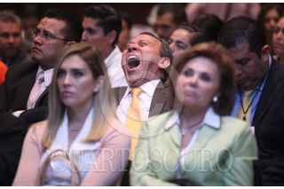 MORELIA, MICHOACÁN, 21MAYO2015.- El debate entre los 6 candidatos a la gubernatura del estado se realizó en el Centro de Convenciones al sur de la ciudad. En la imagen Jesús Zambrano, Delegado del PRD Nacional en Michoacán, bosteza detrás Margarita Estefan Colín y su nuera, durante la realización del Segundo Debate de los aspirantes a ocupar el máximo cargo de esta entidad. FOTO ALAN ORTEGA /CUARTOSCURO.COM