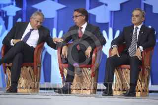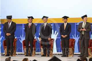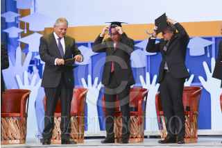 MÉXICO, D.F., 21MAYO2015.- Celebran 10 años el programa Becalos quien se encarga de apoyar a jóvenes que han abandonado sus estudios por falta de dinero, la recaudación de dinero se obtiene a travez de donaciones en cajeros automáticos y es administrada por la Fundación Televisa. En la imagen Luis Robles Miaja, presidente de la Asociación de Bancos de México, Emilio Azcarraga Jean, presidente del grupo Televisa, Miguel Ángel Mancera, jefe de gobierno de la Ciudad de México y Earl Anthony Wayne, embajador de Estados Unidos en México. FOTO: SAÚL LÓPEZ /CUARTOSCURO.COM
