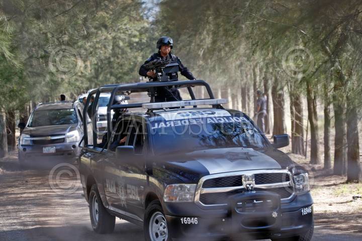 TANHUATO, MICHOACÁN, 22MAYO2015.- En un enfrentamiento entre fuerzas federales y presuntos integrantes de grupos criminales, muy cerca de los límites con Jalisco, se reportan más de 40 muertos, entre ellos un policía federal. En el Rancho del Sol se aseguró decenas de armas largas, cartuchos y granadas, los abatidos pertenecían al cártel Jalisco Nueva Generación, informo el gobierno federal. Aún sin haber una versión oficial el gobernado de Michoacán Salvador Jara, señalo que los policías detectaron una camioneta sospechosa, de la cual les abrieron fuego. El sitio se encuentra acordonado por la PF y el ejército, integrantes del gabinete de seguridad se trasladaron al lugar de los hechos en espera de un parte de los hechos. FOTO: FERNANDO CARRANZA /CUARTOSCURO.COM