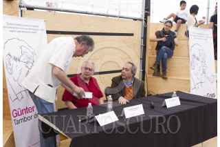 MÉXICO, D.F., 23MAYO2015.- Andrés de Luna, escritor y cinéfilo, José María Espinasa, poeta y ensayista y Juan José Reyes, escritor, durante la charla homenaje al escritor Günter Grass "Tambor de las letras" en el pabellón de la Ciudad de México, Feria de las Culturas Amigas que se realiza en el Zócalo. FOTO: MOISÉS PABLO /CUARTOSCURO.COM