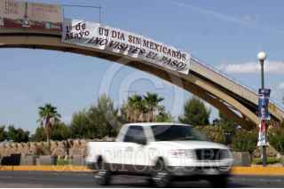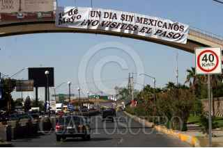 Cd Juarez, Chihuahua, 28ABRIL2006.- "Un dia sin mexicanos, No visites el paso" Reza la leyenda de esta gran manta que fue colocada en un puente peatonal cerca del puente internacional Cordova-Las Americas, que comunica con la ciudad de El Paso Texas, EU, el cual se observa al fondo. Esta es una de las muestras de manifestacion del movimiento hispano que convocan para que el proximo dia Primero de Mayo los habitantes de esta ciudad fronteriza no acudan a realizar conpras en la vecina ciudad de El Paso, con el fin de impedir que el congreso de los EU apruebe leyes de corte antimigrante. Foto: JGuadalupe Perez/CUARTOSCURO.COM