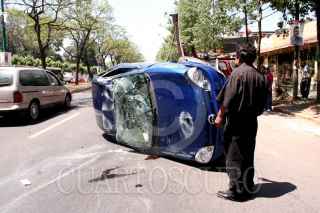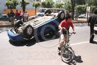 XALAPA,VERACRUZ 28ABRIL2006.- La velocidad inmoderada originó la volcadura de un automóvil en el que viajaban dos personas de las cuales una resultó levemente lesionada y fue canalizada al CEM. este accidente ocurrio en la Av Ruiz Cortínez de esta ciudad. FOTO:Carlos Tischler/CUARTOSCURO.COM