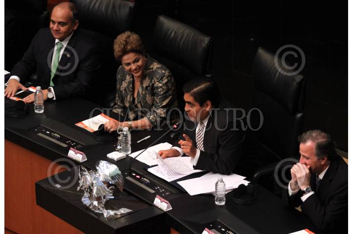 MÉXICO, D.F., 27MAYO2015.- Dilma Rousseff, presidenta de la República Federativa de Brasil, durante su visita a la sesión solemne por su visita de estado en el Senado de la República. En la imagen, el senador Mario Delgado, intenta tomarse una selfie con la presidenta brasileña. FOTO: ADOLFO VLADIMIR /CUARTOSCURO.COM