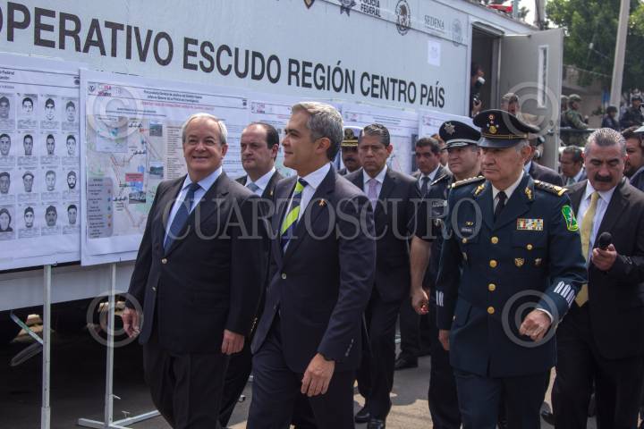 MÉXICO, D.F., 27MAYO2015.- Monte Alejandro Rubido, Comisionado Nacional de Seguridad, junto a Miguel Ángel Mancera y Enrique Galindo Ceballos, comisionado general de la Policía Federal durante el inicio de operativos conjuntos entre Chalco y Tlahuac, elementos del Ejercito Mexicano, Marina, Policía Federal, Secretaria de Seguridad Ciudadana y Policía Capitalina, patrullaran y realizaran operativos para combatir las extorsiones, secuestros y asaltos que en la zona se han registrado en los últimos años he ido incrementado. FOTO: ENRIQUE ORDÓÑEZ /CUARTOSCURO.COM