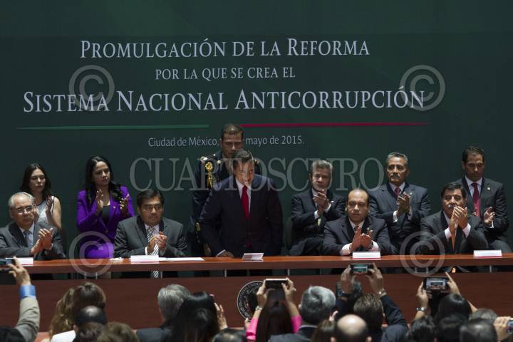 MÉXICO, D.F., 27MAYO2015.- César Camacho Quiróz, dirigente nacional del PRI, conversa con Emilio Gamboa Patrón, coordinador de los senadores del PRI, en la imagen también se observa a Julio César Moreno, presidente de la Cámara de Diputados, durante la ceremonia de Promulgación de la Reforma por la que se crea el Sistema Nacional Anticorrupción, en el Palacio Nacional. FOTO: MOISÉS PABLO /CUARTOSCURO.COM