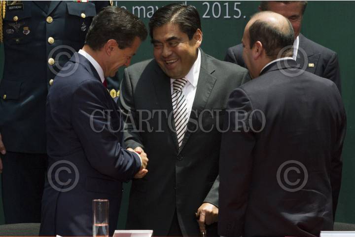 MÉXICO, D.F., 27MAYO2015.- César Camacho Quiróz, dirigente nacional del PRI, conversa con Emilio Gamboa Patrón, coordinador de los senadores del PRI, en la imagen también se observa a Julio César Moreno, presidente de la Cámara de Diputados, durante la ceremonia de Promulgación de la Reforma por la que se crea el Sistema Nacional Anticorrupción, en el Palacio Nacional. FOTO: MOISÉS PABLO /CUARTOSCURO.COM