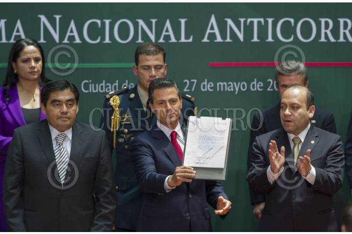 MÉXICO, D.F., 27MAYO2015.- César Camacho Quiróz, dirigente nacional del PRI, conversa con Emilio Gamboa Patrón, coordinador de los senadores del PRI, en la imagen también se observa a Julio César Moreno, presidente de la Cámara de Diputados, durante la ceremonia de Promulgación de la Reforma por la que se crea el Sistema Nacional Anticorrupción, en el Palacio Nacional. FOTO: MOISÉS PABLO /CUARTOSCURO.COM