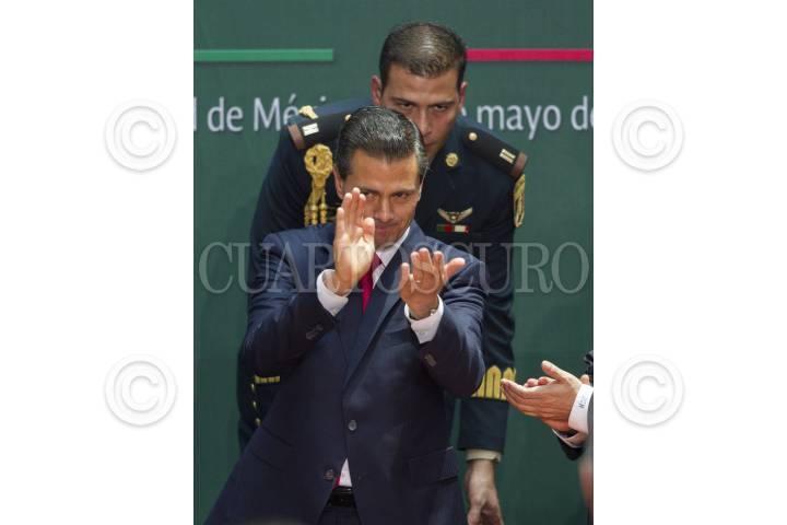 MÉXICO, D.F., 27MAYO2015.- César Camacho Quiróz, dirigente nacional del PRI, conversa con Emilio Gamboa Patrón, coordinador de los senadores del PRI, en la imagen también se observa a Julio César Moreno, presidente de la Cámara de Diputados, durante la ceremonia de Promulgación de la Reforma por la que se crea el Sistema Nacional Anticorrupción, en el Palacio Nacional. FOTO: MOISÉS PABLO /CUARTOSCURO.COM