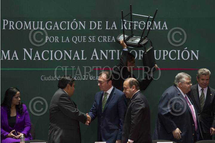 MÉXICO, D.F., 27MAYO2015.- César Camacho Quiróz, dirigente nacional del PRI, conversa con Emilio Gamboa Patrón, coordinador de los senadores del PRI, en la imagen también se observa a Julio César Moreno, presidente de la Cámara de Diputados, durante la ceremonia de Promulgación de la Reforma por la que se crea el Sistema Nacional Anticorrupción, en el Palacio Nacional. FOTO: MOISÉS PABLO /CUARTOSCURO.COM