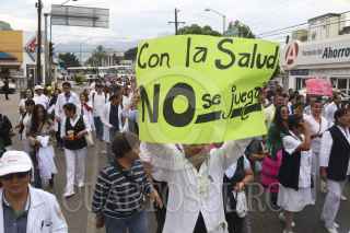 OAXACA, OAXACA, 27MAYO2015.- Integrantes de la sección 35 del Sindicato Nacional de los Trabajadores de la Secretaría de Salud (SNTSSA) marcharon la mañana de este miércoles para exigir el cumplimiento de los acuerdos establecidos con los 50 nosocomios y más de mil unidades médicas de todo el estado, ya que aún cuando han se han firmado acuerdos, estos no se han cumplido, lo que ha provocado que no se haya levantado el paro de labores. FOTO: ARTURO PÉREZ ALFONSO /CUARTOSCURO.COM