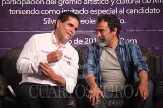 MORELIA, MICHOACÁN, 27MAYO2015.- El candidato a la gubernatura por el Partido de la Revolución Democrática (PRD) Partido del Trabajo (PT), y el actor de origen michoacano Damián Alcázar, se reunieron esta tarde en las instalaciones del Foro artístico El Corral de la Comedia, donde el actor mostró su total apoyo al candidato de izquierda después de firmar una carta de compromisos enfocados a la cultura. El documento signado, plantea un incremento al presupuesto en el rubro cultural y el seguimiento en su aplicación mediante mecanismos de transparencia y la ampliación de programas de apoyo para creadores de todo el estado y la equidad en su distribución. FOTO: ALAN ORTEGA /CUARTOSCURO.COM