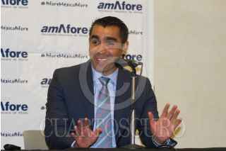 MÉXICO, D.F., 28MAYO2015.- Carlos Noriega, presidente de la amAfore y el ex arbitro Marco Antonio Rodríguez "Chiquimarco" durante un anunció de la Asociación Mexicana de Afores, en donde llama a la población a planificar su fondo de retiros, la conferencia se realizo en el Museo Interactivo de Economía. FOTO: MOISÉS PABLO /CUARTOSCURO.COM