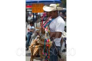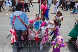 MÉXICO, D.F., 28MAYO2015.- Un vendedor de jicamas, afuera de la iglesia de San Hipólito, acondicionó su puesto para tener a su bebe amarrado a su puesto, sus otras dos hijas también lo acompañan en su trabajo. FOTO: MOISÉS PABLO /CUARTOSCURO.COM
