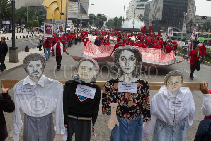 MÉXICO, D.F., 30MAYO2015.- Integrantes del Frente Nacional de Lucha por el Socialismo marcharon por la desaparición forzada de sus dirigentes Gabriel Alberto Cruz Sánchez y Edmundo Reyes Amaya. En el marco de la semana internacional del detenido desaparecido, distintas organizaciones populares y organismos defensores de los derechos humanos, participaron en una jornada de protesta y de denuncia para exigir al estado mexicano la presentación con vida a todos los detenidos desaparecidos en el país. También exigieron la presentación con vida de Teodulfo Torres Soriano, los indígenas triquis Daniela y Virginia Ortiz, el señor Lauro Juárez, Gabriel Gómez Caña, del defensor de derechos humanos Francisco Paredes Ruiz y los mas de 110 mil detenidos desaparecidos por el régimen. Los manifestantes partieron de la Secretaría de Gobernación rumbo a la PGR, ubicada en avenida Reforma. FOTO: MOISÉS PABLO /CUARTOSCURO.COM