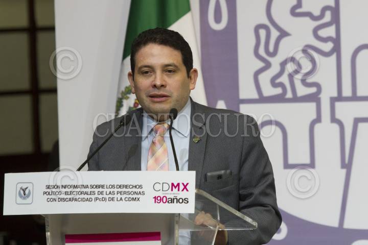 MÉXICO, D.F. 02JUNIO2015.- Gustavo Sánchez Martínez, deportista y campeón paralímpico, durante la sesión informativa de los derechos político-electorales de la personas con discapacidad en la Ciudad de México. En la imagen se observan a Javier Agustín Quijano Orvañanos, Presidente de la Confederación Mexicana de Organizaciones en favor de las Personas con Discapacidad Intelectual y Miguel Ángel Mancera, Jefe de Gobierno. FOTO: MOISÉS PABLO /CUARTOSCURO.COM