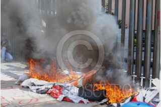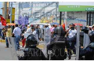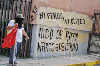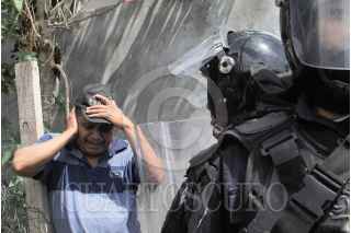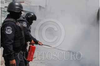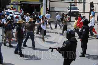 CHILPANCINGO, GUERRER, 04 JUNIO 2015.- Profesores ‘cetegistas’ de la fracción de Ramos Reyes Guerrero de la Coordinadora Estatal de Trabajadores de la Educación de Guerrero (CETEG), acudieron a la oficina estatal del PRI, en donde realizaron pintas, quemaron propaganda, lanzaron consignas en contra de los legisladores y arrojaron piedras a las ventanas de la biblioteca. Fueron dispersados por policías antimotines; en el trayecto lograron retener a un profesor a quien señalaban como el presunto culpable de haber iniciado el lanzamiento de piedras. FOTOS: JOSÉ I. HERNÁNDEZ /CUARTOSCURO.COM