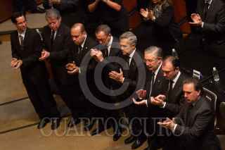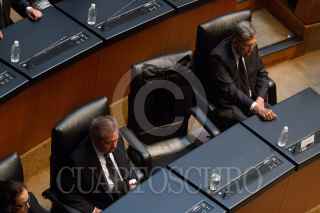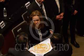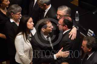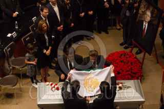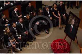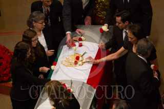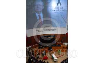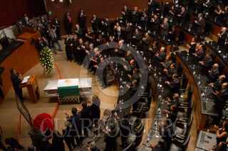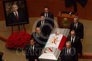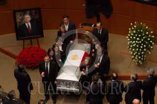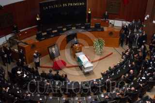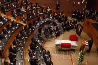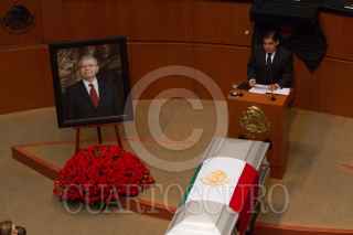 MÉXICO, D.F., 06JUNIO2015.- En el Senado de la República se realizó un homenaje de cuerpo presente al senador Manuel Camacho Solís, quien falleció víctima del cáncer, a la ceremonia asistieron sus hijos encabezados por su hijo Manuel Camacho velasco y su esposa Mónica Vanderbilt, los representantes de los poderes judicial; el presidente de la SCJN Luis María Aguilar, en representación del ejecutivo; el secretario de Hacienda Luis Videgaray Caso, legislativo; Miguel Barbosa, presidente del Senado y Julio César Moreno, presidente de la Cámara de Diputados, además del Jefe de Gobierno Miguel Ángel Mancera y sus compañeros senadores. El féretro fue colocado al centro de la sede la Cámara Alta en donde el presidente del Senado Miguel Barbosa, destacó sus virtudes como político, en donde destaco su capacidad negociadora y de consenso. Su hijo Manuel Camacho Velasco leyó una carta de su padre dedicada a sus hijos, al finalizar la ceremonia solemne los coordinadores parlamentarios le entregaron la bandera a su viuda. En el escaño que ocupo durante su labor senatorial fue colocado un moño negro y fue flanqueado por Porfirio Muñoz Ledo y Cuauhtémoc Cárdenas. FOTO: MOISÉS PABLO /CUARTOSCURO.COM