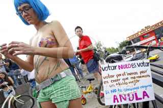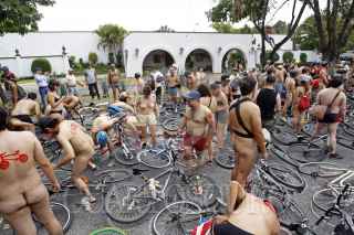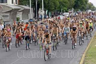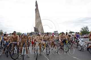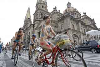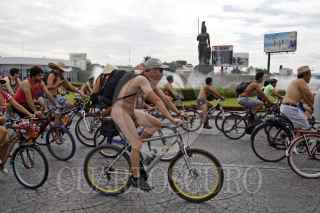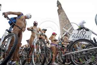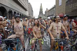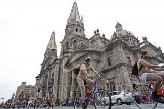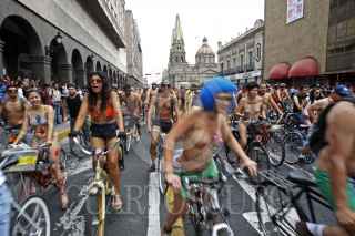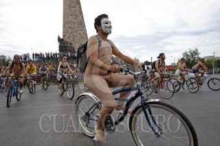 GUADALAJARA, JALISCO. 06JUNIO2015.- Esta mañana cientos de ciclistas tapatíos realizaron la quinta rodada al desnudo denominada “World Naked Bike Ride Guadalajara”, en donde recorrieron las principales avenidas de la ciudad, partiendo de la Glorieta de los Niños Héroes, pasando por la Glorieta de la Minerva, haciendo escala en Casa Jalisco, en donde realizaron una protesta pidiendo al Gobernador del estado, Jorge Aristóteles Sandoval Díaz, promueva el uso de la bicicleta y menos el uso del automóvil, así continuando su recorrido hacia el centro de la ciudad pasaron por la Catedral Metropolitana rumbo al punto de partida, mismo donde finalizaron el recorrido. FOTO: FERNANDO CARRANZA GARCIA / CUARTOSCURO.COM