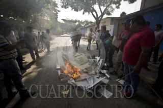 JUCHITÁN, OAXACA, 07JUNIO2015.- Este domingo se vivió una jornada electoral con mucha participación tanto de los profesores adjuntos al Sindicato Nacional de Trabajadores de la Educación, como del ejército mexicano en conjunto con las fuerzas policiales del Estado y municipales; mientras los maestros marchaban por las calles de la ciudad con el propósito de echar abajo las elecciones federales, consiguieron quemar más de 60 urnas, sin hacer daño a ni un civil y las fuerzas del orden público, accionaron de manera pacifica hasta cierto punto, siguiendo la marcha de cerca para prevenir cualquier tipo de violencia que pudiera suscitarse, recordando que en la ciudad de Pochutla, la sociedad civil enfrento a los adjuntos de la SNTE el pasado sábado 06 de junio, hasta el momento los comicios penden de un hilo, para declararse una elección fallida. FOTO: FREYNA LUCERO /CUARTOSCURO.COM