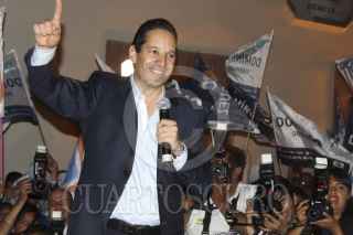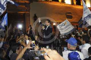 QUERÉTARO, QUERÉTARO, 08JUNIO2015.- Francisco Domínguez, candidato del PAN al gobierno estatal, celebró su virtual triunfo como gobernador de Querétaro, en Plaza de Armas, junto a más de 500 personas que lo acompañaron la madrugada de este lunes con matracas, cornetas, silbatos, tambores y porras. FOTO: GERARDO GONZÁLEZ /CUARTOSCURO.COM