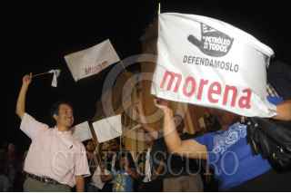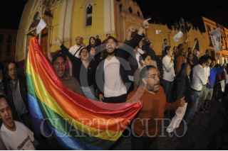 XALAPA, VERACRUZ, 08JUNIO15.- Ayer por la noche, Cuitláhuac García, candidato a la diputación federal por Morena, celebró el triunfo del partido acompañado por integrantes de la comunidad lésbico gay en la Plaza Regina Martínez. FOTO: RUBÉN ESPINOSA / CUARTOSCURO.COM