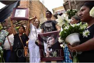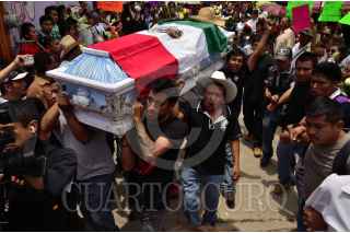 TLAPA, GUERRERO, 09JUNIO2015.- Miles de personas entre amistades, estudiantes, profesores, compañeros de lucha y sus familiares realizaron una marcha fúnebre con el cuerpo de Antonio Vivar Díaz, joven asesinado por policías federales el pasado domingo; su cuerpo fue presentado por última vez fue llevado al pasillo del ayuntamiento donde dio su lucha por ochos meses para exigir la presentación con vida de los 43 normalistas desaparecidos, minutos después trasladado a la catedral de San Agustín en donde se realizó la misa de cuerpo presente. FOTO: SALVADOR CISNEROS SILVA /CUARTOSCURO.COM