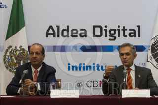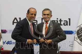 MÉXICO, D.F., 10JUNIO2015.- Héctor Slim Seade, director general de Teléfonos de México y Miguel Ángel Mancera, Jefe de Gobierno, ofrecieron una conferencia de prensa para hablar sobre la instalación de la Aldea Digital en el Zócalo, la rueda de prensa se dió en el salón Juárez del Antiguo Palacio del Ayuntamiento. FOTO: MOISÉS PABLO /CUARTOSCURO.COM