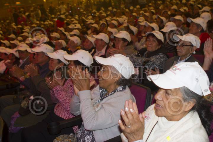 MÉXICO, D.F., 10JUNIO2015.- Miguel Ángel Mancera, Jefe de Gobierno, es abrazado por una asistente a la ceremonia de arranque del programa de turismo social "Sonrisas por tu Ciudad 2015" en el Teatro Metropolitan. FOTO: MOISÉS PABLO /CUARTOSCURO.COM