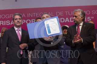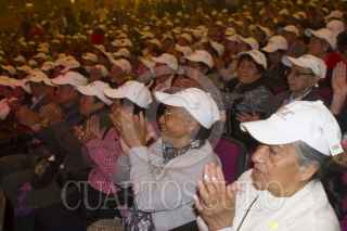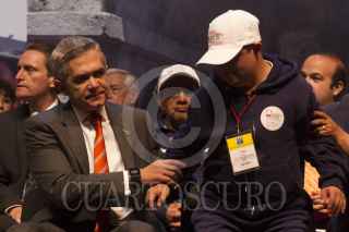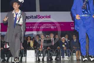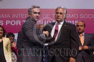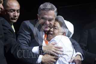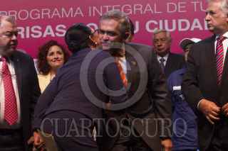 MÉXICO, D.F., 10JUNIO2015.- Miguel Ángel Mancera, Jefe de Gobierno, es abrazado por una asistente a la ceremonia de arranque del programa de turismo social "Sonrisas por tu Ciudad 2015" en el Teatro Metropolitan. FOTO: MOISÉS PABLO /CUARTOSCURO.COM