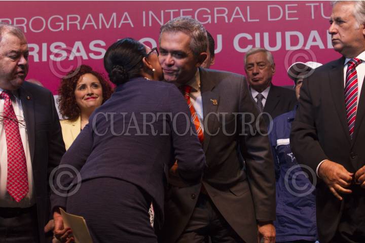 MÉXICO, D.F., 10JUNIO2015.- Miguel Ángel Mancera, Jefe de Gobierno, es abrazado por una asistente a la ceremonia de arranque del programa de turismo social "Sonrisas por tu Ciudad 2015" en el Teatro Metropolitan. FOTO: MOISÉS PABLO /CUARTOSCURO.COM