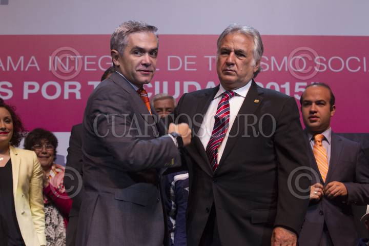MÉXICO, D.F., 10JUNIO2015.- Miguel Ángel Mancera, Jefe de Gobierno, es abrazado por una asistente a la ceremonia de arranque del programa de turismo social "Sonrisas por tu Ciudad 2015" en el Teatro Metropolitan. FOTO: MOISÉS PABLO /CUARTOSCURO.COM