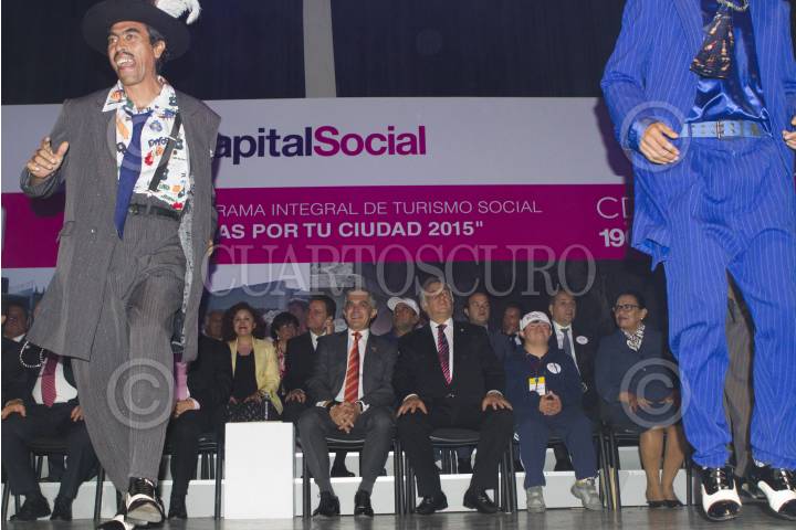 MÉXICO, D.F., 10JUNIO2015.- Miguel Ángel Mancera, Jefe de Gobierno, es abrazado por una asistente a la ceremonia de arranque del programa de turismo social "Sonrisas por tu Ciudad 2015" en el Teatro Metropolitan. FOTO: MOISÉS PABLO /CUARTOSCURO.COM