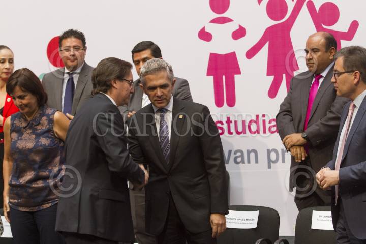 MÉXICO, D.F., 12JUNIO2015.- Miguel Ángel Mancera, Jefe de Gobierno, Salomón Chertorivski, Secretaría de Desarrollo Económico, Julio Cesar Serna, administrador general de la Central de Abasto de la Ciudad de México y Miguel Torruco, secretario de Turismo del DF, durante un evento en donde se conmemoro el Día Mundial contra el Trabajo Infantil, en el Antiguo Palacio del Ayuntamiento. FOTO: MOISÉS PABLO /CUARTOSCURO.COM