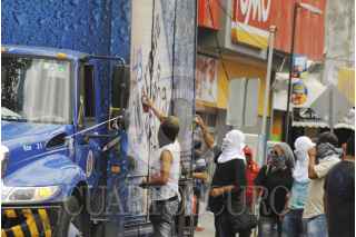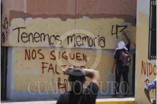 CHILPANCINGO, GUERRERO, 12JUNIO2015.- Profesores que mantienen el plantón en la plaza primer Congreso de Anáhuac, en el centro de la ciudad, normalista y padres de familia de los 43 desaparecidos en Iguala, marcharon al congreso al palacio de gobierno, en donde hicieron pintas. FOTO: JOSÉ I. HERNÁNDEZ /CUARTOSCURO.COM