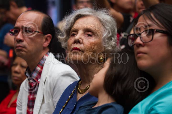 MÉXICO, D.F., 13JUNIO2015.- El poeta Eduardo Lizalde fue homenajeado en el Museo de la Ciudad de México, ahí compartió la mesa con José María Espinasa, Evodio Escalante, Hugo Gutiérrez Vega, María Banda y el secretario de Cultura Eduardo Vázquez, quienes compartieron su visión acerca de su obra. En la imagen el literato conversa con la escritora Elena Poniatowska. FOTO: MOISÉS PABLO /CUARTOSCURO.COM