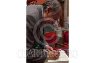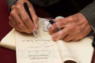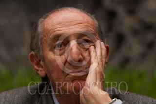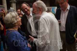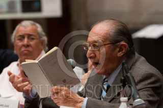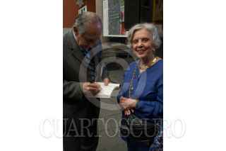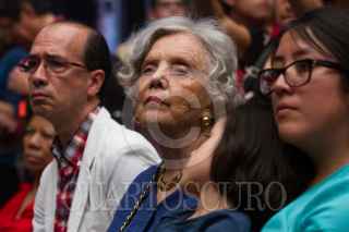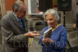 MÉXICO, D.F., 13JUNIO2015.- El poeta Eduardo Lizalde fue homenajeado en el Museo de la Ciudad de México, ahí compartió la mesa con José María Espinasa, Evodio Escalante, Hugo Gutiérrez Vega, María Banda y el secretario de Cultura Eduardo Vázquez, quienes compartieron su visión acerca de su obra. En la imagen el literato conversa con la escritora Elena Poniatowska. FOTO: MOISÉS PABLO /CUARTOSCURO.COM