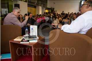 MEXICO, D.F., 13JUNIO2015.- Rafael Barajas "El Fisgón" y Alfonso Morales participaron en una mesa de dialogo en torno a la estrecha relación que Carlos Monsiváis mantuvo con la fotografía y la actividad de los fotógrafos mexicanos, en el marco del homenaje celebrado al autor a pocos días de su aniversario luctuoso. FOTO: DAVID POLO /CUARTOSCURO.COM