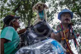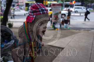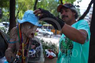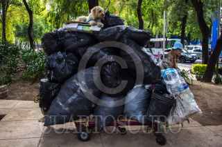 MÉXICO, D.F., 15JUNIO2015.- Un señor mejor conocido como El "Pelucas", recorre las calles de la zona centro de la ciudad por las noches para recolectar artículos reciclables y que aun se puedan vender de la basura que se acumula en las calles para así poder sobrevivir. El "Pelucas" junto a su perro que recogió en un basurero y un muñeco que lo apodo como el, son sus únicos compañeros mismos que cuidan las bolsas recolectadas cuando este se va a tomar por la mañana con amigos que conoce. FOTO: ENRIQUE ORDÓÑEZ /CUARTOSCURO.COM