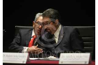 MORELIA, MICHOACÁN, 15JUNIO2015.- Salvador Jara Guerrero, Gobernador del estado y Medardo Serna rector de la Universida Michoacana, dialogan durante la entrega de reconocimiento por la entrega del resguardo del documento de autonomía que recibió la Universidad Michoacana de San Nicolás de Hidalgo (UMSNH) de parte de la Universidad Nacional Autónoma de México (UNAM) FOTO: ALAN ORTEGA /CUARTOSCURO.COM