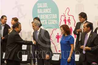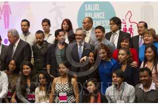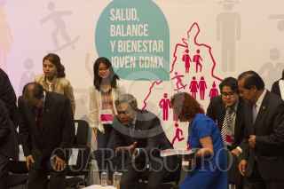 MÉXICO, D.F., 16JUNIO2015.- Miguel Ángel Mancera, Jefe de Gobierno, y María Fernanda Olvera Cabrera, titular del Injuve DF, durante el lanzamiento de la estrategia de salud, balance y bienestar joven, en el Antiguo Palacio del Ayuntamiento. FOTO: MOISÉS PABLO /CUARTOSCURO.COM