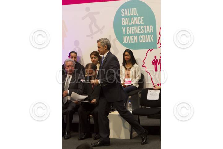 MÉXICO, D.F., 16JUNIO2015.- Miguel Ángel Mancera, Jefe de Gobierno, y María Fernanda Olvera Cabrera, titular del Injuve DF, durante el lanzamiento de la estrategia de salud, balance y bienestar joven, en el Antiguo Palacio del Ayuntamiento. FOTO: MOISÉS PABLO /CUARTOSCURO.COM