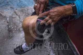 MÉXICO, D.F., 16JUNIO2015.- Doña Bertha, mejor conocida como “Bertitha” quien a sus mas de 60 años se dedica a acomodar y lavar carros para poder sobrevivir en colonia roma frente al predio que habita y que se encuentra entre lo que fueron las ruinas de un edificio caído en el terremoto de 1985 fue agredida por una mujer de aproximadamente 25 años quien le disparo desde su balcón con una pistola de diábolos causándole daños en el glúteo y la rodilla. FOTO: ENRIQUE ORDÓÑEZ /CUARTOSCURO.COM
