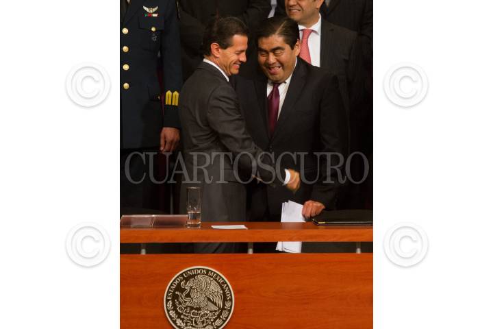 MÉXICO, D.F., 23JUNIO2015.- Enrique Peña Nieto, Presidente de México, y Miguel Barbosa, presidente de la mesa directiva del Senado, durante la instalación del Consejo del Sistema Nacional de Transparencia, Acceso a la Información y Protección de Datos Personales, en evento realizado en el WTC. FOTO: MOISÉS PABLO /CUARTOSCURO.COM