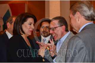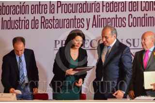 MÉXICO, D.F., 24JUNIO2015.- Lorena Martínez, procuradora federal del consumidor, y a la derecha Hugo Vela, presidente de la Cámara Nacional de la Industria de Restaurantes y Alimentos Condimentados (Canirac), después de la firma de convenio entre las dos instituciones. FOTO: MARÍA JOSÉ MARTÍNEZ /CUARTOSCURO.COM