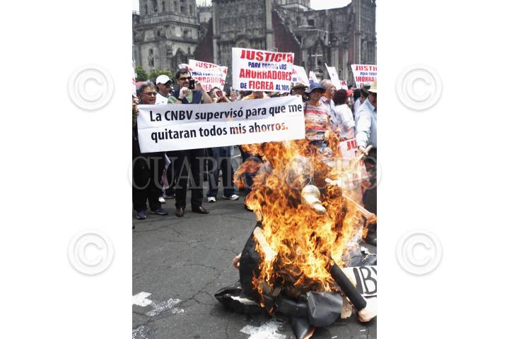 MÉXICO, D.F., 25JUNIO2015.- Ahorradores de Ficrea se manifestaron afuera de Palacio Nacional para exigirle a Luis Videgaray, secretario de Hacienda, el pago de sus ahorros al cien por ciento, tras ser defraudados hace algunos meses por esta empresa de fondo de ahorros avalado por la Comisión Nacional Bancaria y de Valores. En su protesta quemaron tres ratas con los letreros de la SHCP y CNBV. FOTO: MOISÉS PABLO /CUARTOSCURO.COM