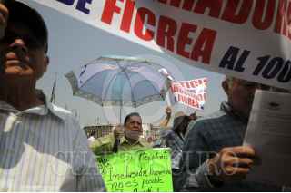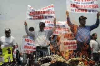 MÉXICO, D.F., 25JUNIO15.- Ahorradores defraudados por FICREA marcharon alrededor de la Plaza de la Constitución hacía el Palacio Nacional en donde quemaron unas piñatas en forma de ratas haciendo referencia a la SHCP, CONDUSEF y CNBV para exigir la devolución al 100 por ciento de su inversión. FOTO: RUBÉN ESPINOSA /CUARTOSCURO.COM