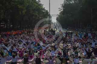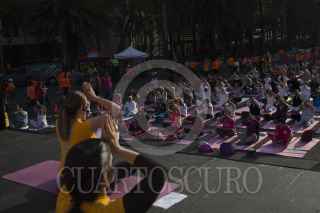 MÉXICO, D.F., 28 JUNIO2015.- Decenas de personas acudieron a la clase masiva de Yoga organizada por el Instituto del Deporte de la Ciudad de México en la glorieta de la Palma. FOTO: DANIELA ZAPATA /CUARTOSCURO.COM