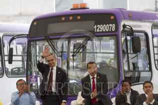 MÉXICO, D.F., 01JULIO2015.- Miguel Ángel Mancera, Jefe de Gobierno, supervisa una de las 112 unidades que recorrerán el corredor de transporte público Peñón-Panteón San Isidro, en el Deportivo Ingeniero Eduardo Molina. La nuevas unidades sustituirán 207 microbuses y autobuses obsoletos. El secretario de Movilidad señalo que las nuevas unidades funcionan con diesel, cuentan con cuatro cámaras de vigilancia, geolocalizador y sistema de recaudo, el cual es de $5.50. Los chóferes fueron capacitados por la STyFE, la empresa Mercedes Benz en temas como relaciones humanas, alcoholemia y superación personal. El corredor cuenta con una longitud de 143.5 kilómetros, los cuales se espera los recorrerán en 55 minutos, con paradas establecidas. FOTO: MOISÉS PABLO /CUARTOSCURO.COM